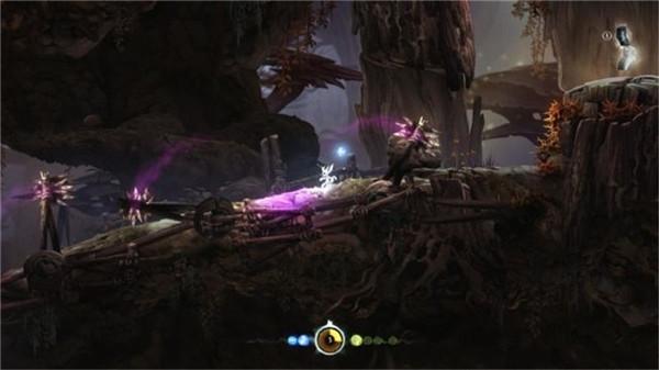 5、往右侧原路折返(往第二步的坑口方向走去),途中会遇到会喷出散发毒箭的爬行虫,这些毒箭的飞行轨迹都不同,所以要留意其抛物线确认落点,然后奥日就做好躲避的准备。最好就是让奥日躲在一些有遮挡物后,因为目前精灵之火的攻击距离没有加强,所以要稍微靠近敌人再发动攻击。去到坑口时,使用精灵之火击破坑底的尖刺球,此时会露出一个弹床,可以让奥日跳回到上层。击破弹床右侧的一排尖刺球,奥日会发现到一个能量井(或叫作精灵之井),能量井可以为奥日恢复满所有的能量,使用之后学会的飞檐走壁(后期才能学会)爬上右侧的岩壁可以获得能量核心(2/15)。