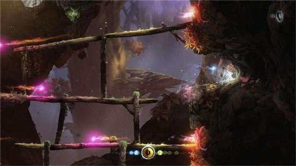 15、上方出现了三段木桥,一段木桥的右侧都会有连续喷出炎弹的花朵,这些花朵哪怕是碰到它们也会受到伤害。奥日需要以飞檐走壁登上一层木桥,在每一段木桥上奥日都需要用跳跃来躲避飞来的炎弹,最好就是跳到左右两端的石台上暂时缓一缓。在二层右端的石台上可以获得一个楔石,在第三段石桥左侧的石台上可以获得另一个楔石。