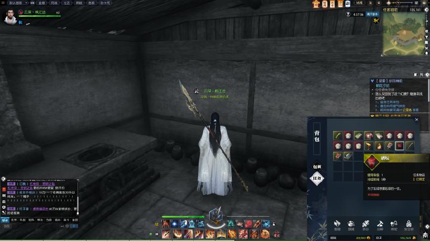 这棵树在坐标(134,111),要挖信还要去拿锄头,锄头在回忆里有印象吧,也在现实中的后厨门口(138,167),拾取锄头后回到松树旁,打开任务背包右键使用锄头,得到任老头的信。