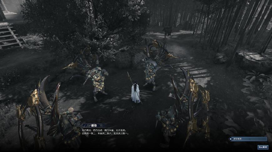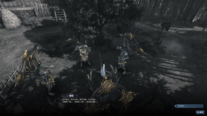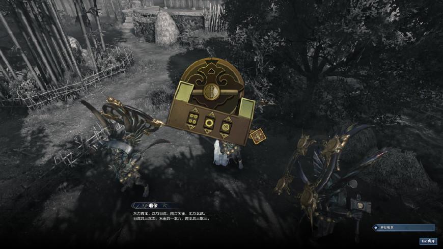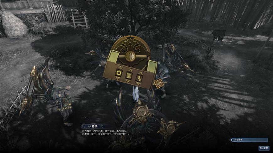 然后就是找到对应的青龙白虎朱雀玄武解码了,提示是“东方青龙,西方白虎,南方朱雀,北方玄武”,在游戏场景里,以上北下南,左西右东的方位就可以找到对应的神像了,一一用密码解锁即可。