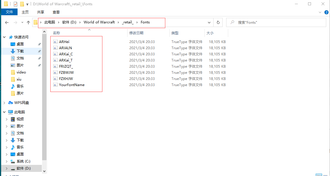 第二步:将字体文件复制八份,将八份文件分别重命名为:ARHei、ARIALN、ARKai_C、ARKai_T、FRIZQT_、FZBWJW、FZXHJW、YourFontName。