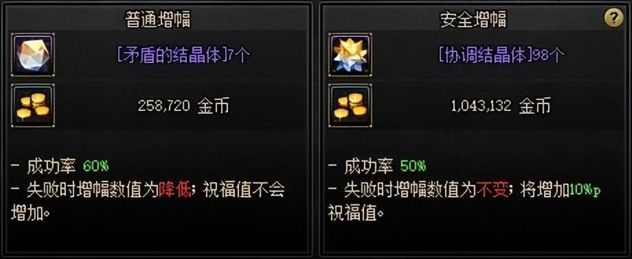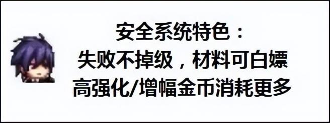 安全系统特色,可以消耗材料,抵扣部分金币,强化/增幅失败不掉级,使用新系统保底强化+12/增幅+10。