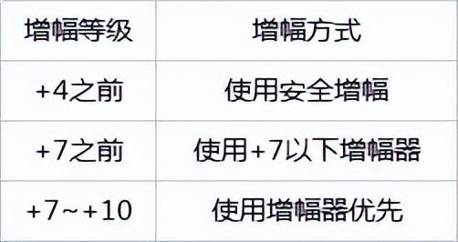 +4之前(武器除外,武器建议用+7增幅卷):百分百成功,安全增幅消耗金币与直接消耗大致相同,但是用“协调结晶体”节约了“矛盾结晶”的消耗。+7之前:使用,+7以下增幅器、活动增幅的+7增幅卷最好对+0增幅的装备使用,尽量不对已经增幅过的装备使用。+7~+10:建议使用普通增幅器,安全增幅武器期望值已经超过部分活动时+10增幅卷价格,花2~3千万从+7增幅到+10不划算。