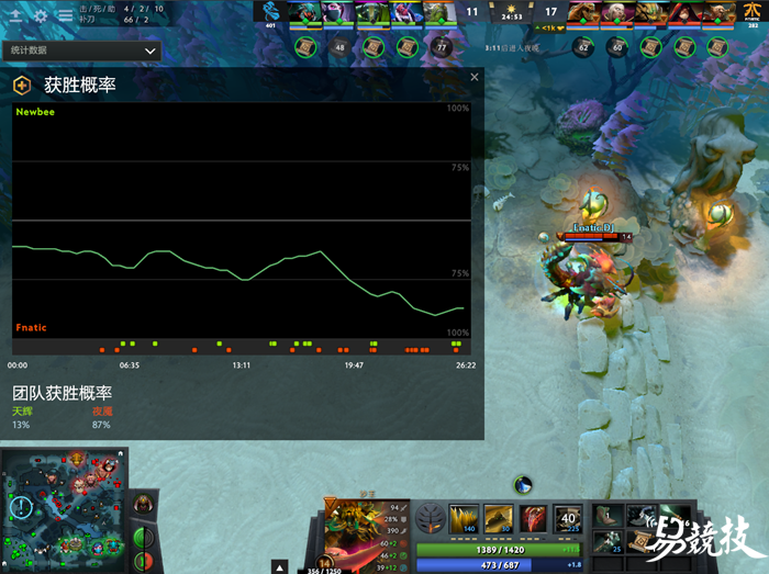 在24分钟Newbee在和Fnatic经济持平的情况下依旧是一个“19开”的局势