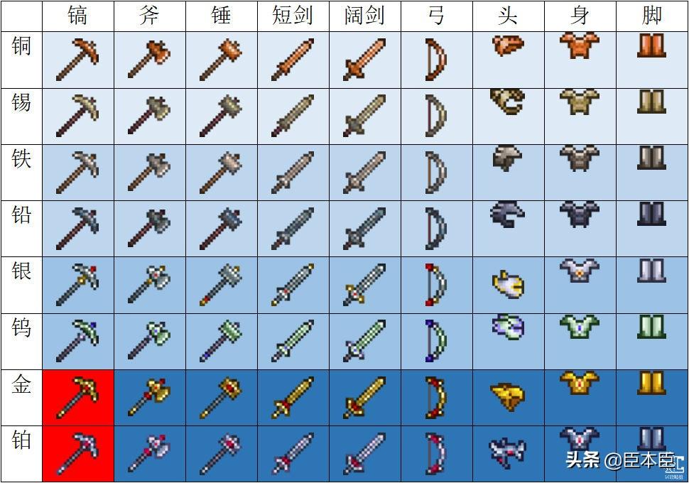 ,甚至连这个镐子都不用做。为什么不做?首先是工具上,需要镐子是以后为了去挖陨石需要镐力,而斧子用来砍树、锤子用来锤墙和改变物块形状,基础斧锤的已经足够了,而稍高级的工具也不会提升明显的速度。武器上,从地表和地下发现的宝箱中已经拥有了初步的好用的武器,如回旋镖