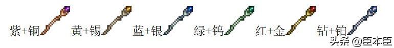 宝石法杖是初期就能够制作的魔法武器,由宝石+金属锭制作。由于一个世界只能生成4种金属矿石而无其他4种,所以以上法杖一般情况只能制作三种。 一个铁锭(或者铅锭)可以在铁砧处制作10个链条。和绳子一样可以攀爬,不过更多地用于其他物品的合成制作。例如4个链条可以和多余的生命水晶来制作心型灯笼,类似篝火提供一个缓慢回血的buff心灯。