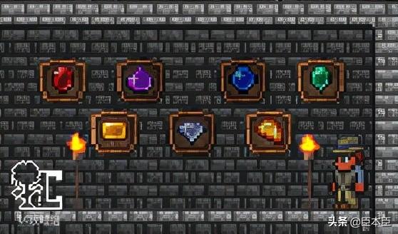 等等,都有较好的使用体验,而金属武器相对价位只提供了一点更高的伤害,剩下的都无明显区别。盔甲上因为接下来打史莱姆王会掉落忍者套装,所以有富余的矿物就做吧,没有也无所谓,因为前期盔甲装备只提供防御力加成且更新换代太快了。 宝石一共有七种: