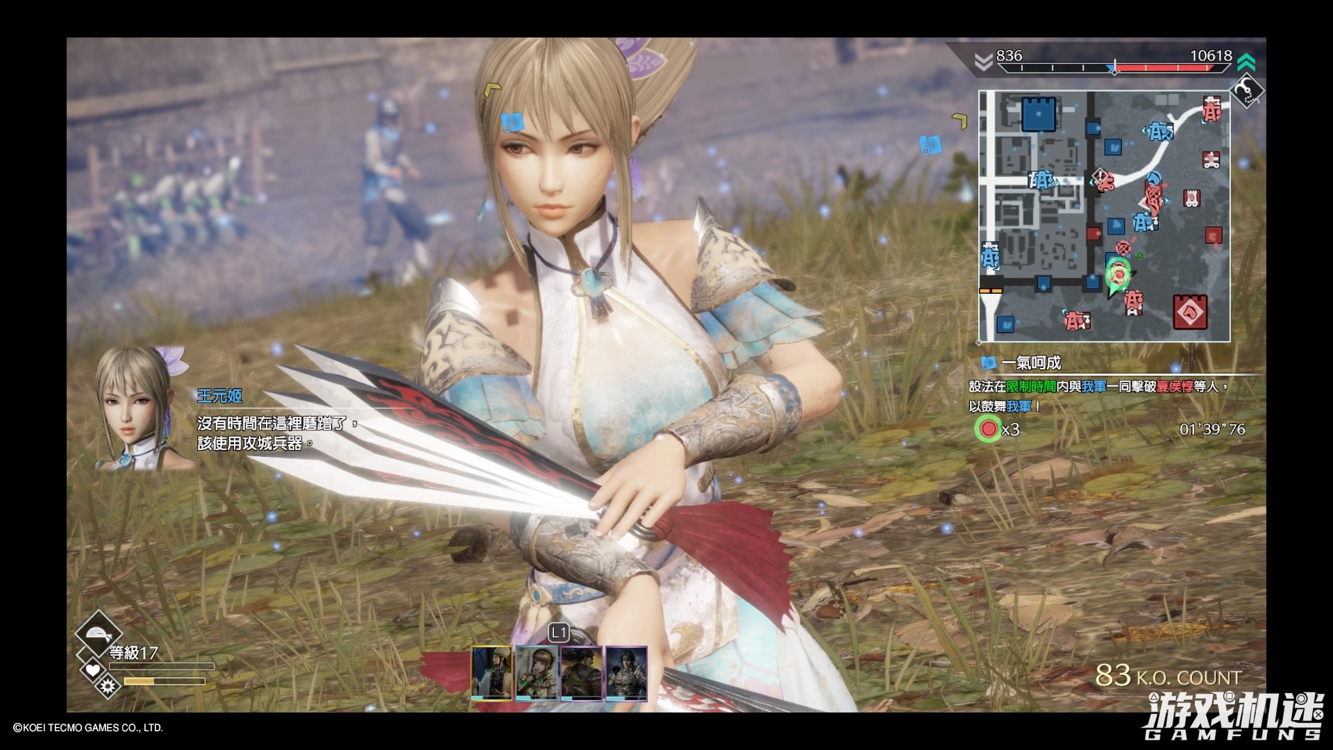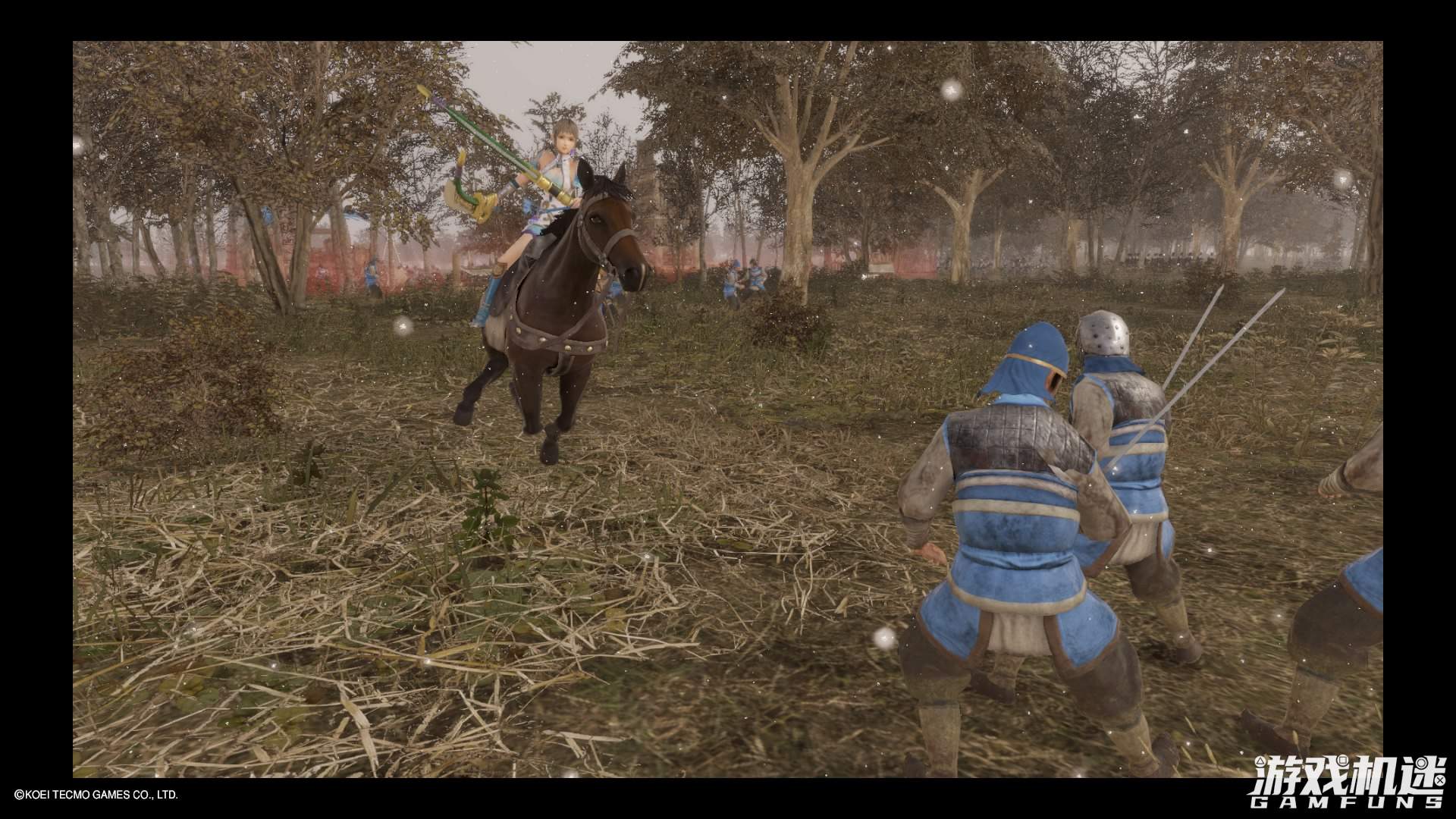 这种过程带来的快感很奇妙。简言之,《无双》式的快感,是一种“欲扬先抑”式的快感。先用超级多的小兵,把玩家看烦了,然后再给玩家机会,适当使用范围广阔的秘计或无双技将碍眼的小兵清理殆尽。每次一套连招下去,看着干干净净的战场,我都会获得巨大的满足。游戏中占领据点后剩余存活的小兵会变成逃兵状态,不再有威胁,但我有时还是忍不住追上去将之屠戮殆尽,方称心头之快。