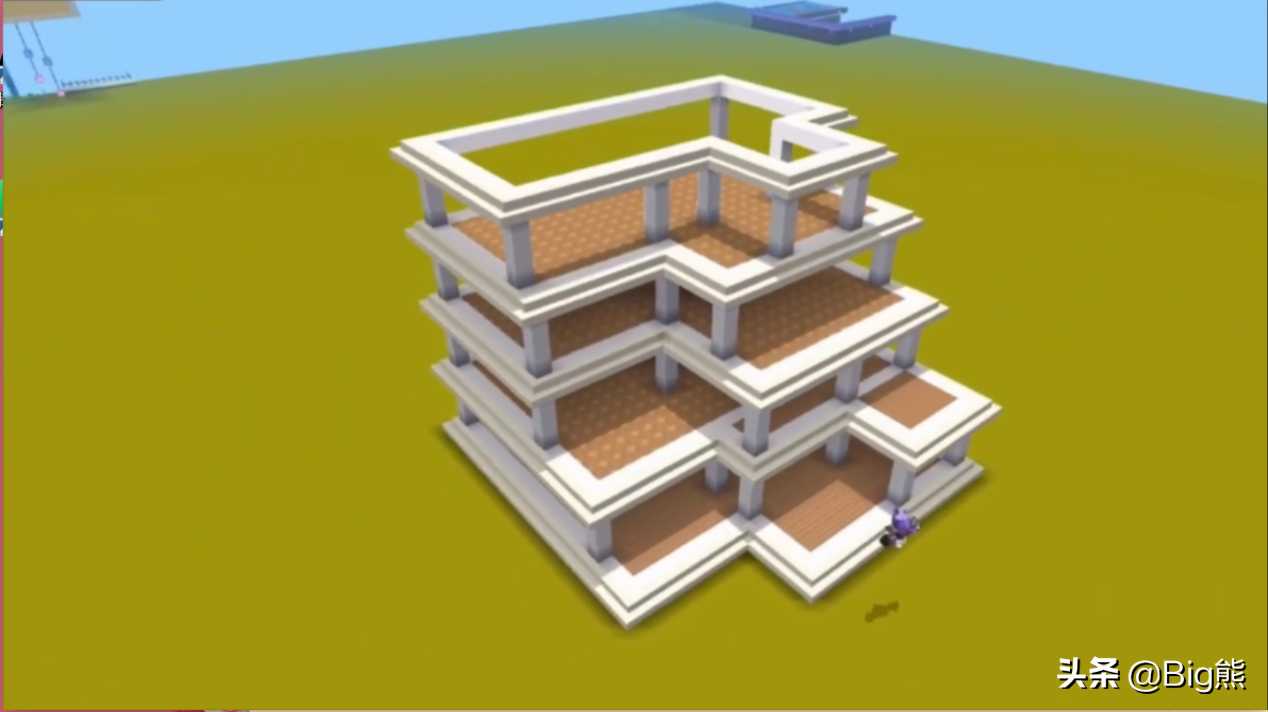屋顶的搭建跟最下面的边框直接相关,什么样的边框确定什么样的屋顶。以设计一栋楼房为例,首先在地面上搭建一个基本边框,框架内填充地面材质的方块。然后从框架边缘的合适位置向上搭建,设计出一层的形状。墙壁留到整体都设计完之后再填充。