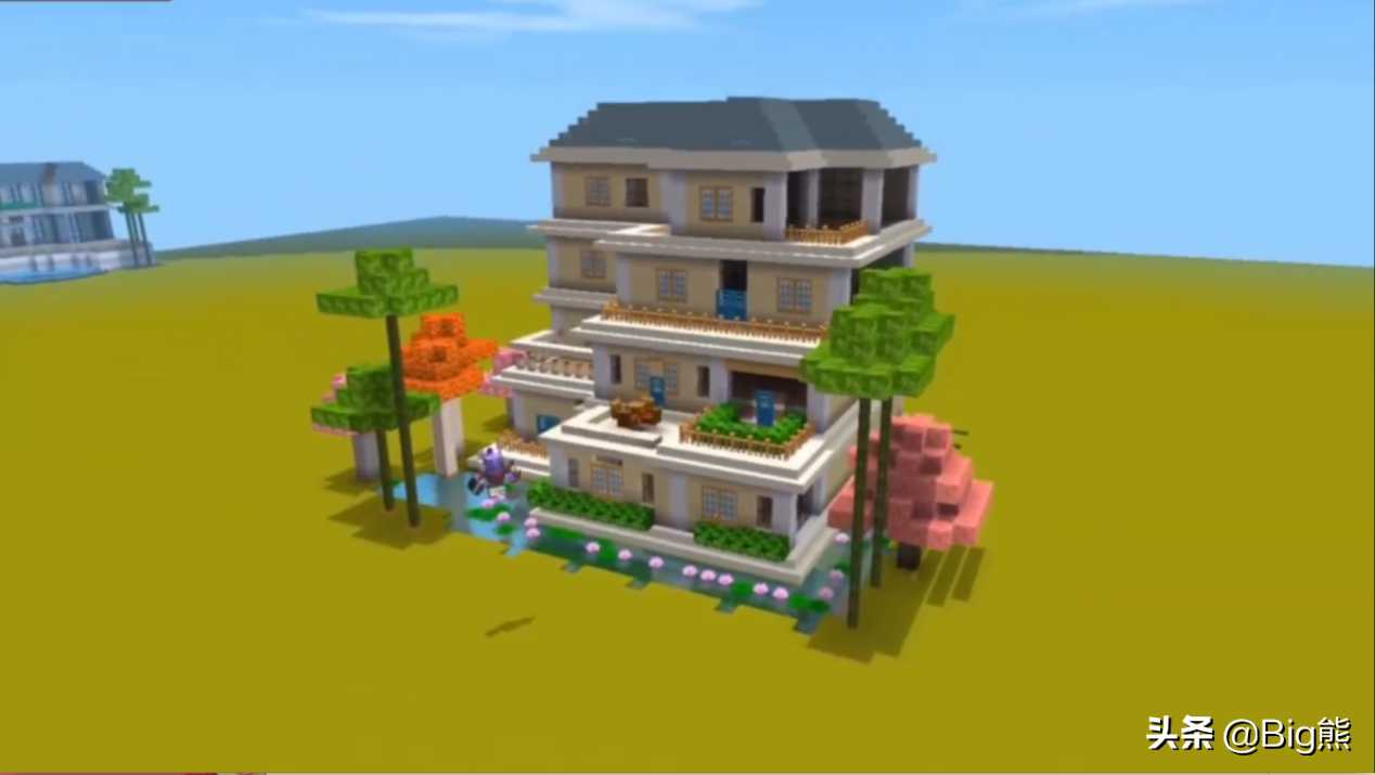 搭建完整体的框架后,在每层的边缘用楼梯方块围一圈,这样显得更有装饰效果。玩家也可以采取其他装饰方法,比如做成大的落地窗,设计飞檐之类的。之后就是墙壁的填充和屋顶的设计,墙壁填充时要注意保留窗户的位置,阳台的边缘用栏杆围上。屋顶设计成斜坡屋顶或者平顶都行,这种大型的房子一般都是采用斜坡屋顶,搭建方法都是一样的。每个角的位置设计成屋顶的面之间的交线,平直的地方用楼梯方块向中间靠拢堆叠,最后就能做出一个完整的斜坡屋顶。