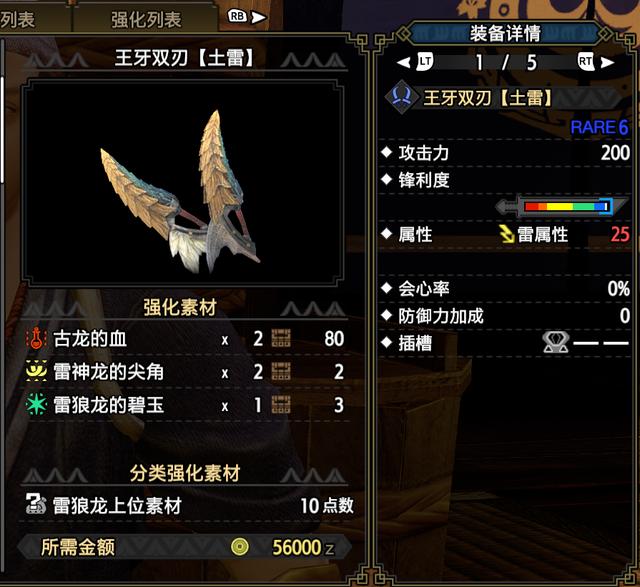 技能:看破5,雷属性5,攻击4,弱点特效3,匠3,超会心1,刚刃1,鬼火缠1