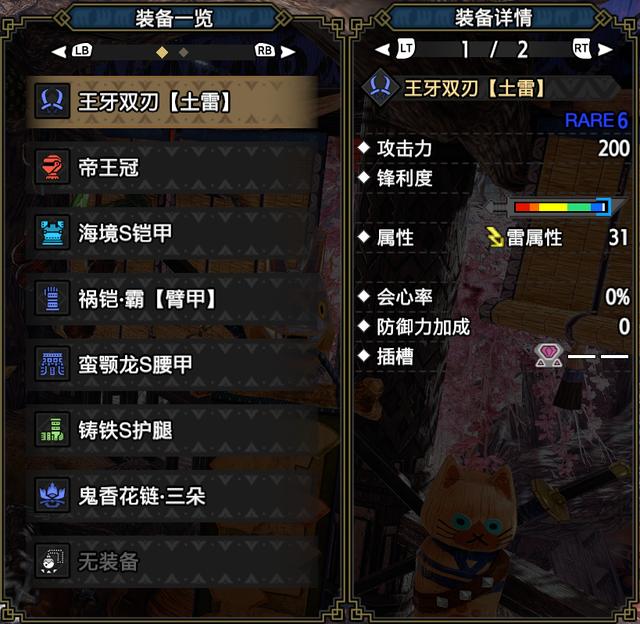 接下来我们来聊聊配装思路,考虑到锁白和插槽的问题,个人推荐用怨喵手相对比较划算,属性上看的话提高方向可以考虑超会心/看破/攻击/刚刃这几个方向考虑。