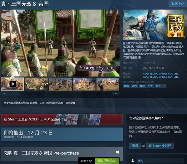 经过几轮跳票,光荣旗下的《真三国无双8:帝国(Shin Sangokumusou 8:Empires)》定于2021年12月发售,目前游戏已在Steam开启预购,过去标准版预购价329元。此外游戏Steam页面信息也同步更新,PC配置需求公布,其中玩家最低需i5 4460+GTX 760显卡,推荐配置i7 3770+GTX 1660显卡。