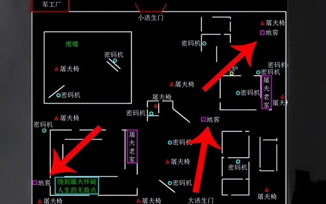 军工厂这个地方一个藏着三个地窖,这些位置非常不好找到。首先,第一个地方在一个小房子的后面,这个地方有一个有许多垃圾的废墟,这个地方就有一个,很小很小,它附近有识别性也就只有一个小车,仔细找还是能找到的。其次,第二个地方在最中间大场地的密码机附近,一般不管重开多少次,每一次刷新的新地图的中心大广场上都会刷新一个密码机,所以说这个隐藏点是最好找到的。最后,第三个地方在一个大房子的最左边,这里也是有一个废墟的,但是这个地方有一个椅子,也就是敌人发射我们的一个椅子,这个好好找,但是也是一个比较危险的地方,一般敌人会在这附近。