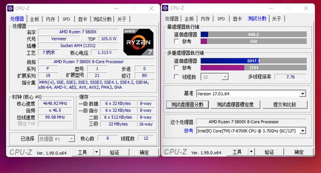 CPU方面就用5800X和5600X来对比一下吧,5600X作为千元CPU其实还算挺主流的,能玩3A游戏就不差这种级别的CPU,这里用5800X关闭两核心调整频率模拟一下,三级缓存本来也是一致,CPU-Z简单跑分和真实的5600X也是几乎一致。