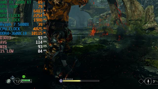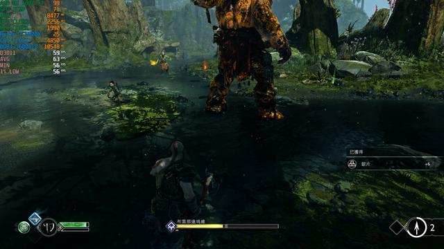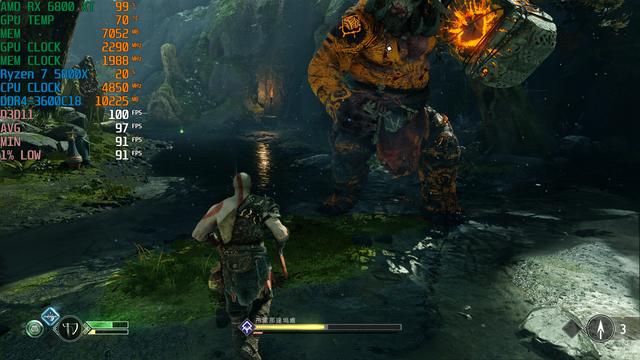 游戏流程进行到一大半,发现《战神4》PC版的帧数表现还算挺稳定(V1.0.5版本),测试场景只挑选了和山怪布雷那达坞维对决这一段,这场景有丰富的丛林+浅水复杂区域,BOSS会释放出火焰和击打效果,旁边还有小怪不断骚扰,能够充分测试硬件性能,每一款显卡记录FSR超级质量开启前后的平均帧数。