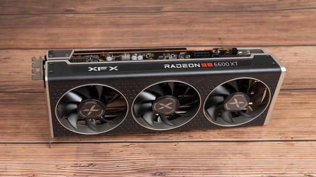 第二款是RX 6600 XT海外版OC,它更像加长版的RX 6600黑狼版,家族风格是比较统一的,比较吸睛的是顶部拥有AMD RADEON和XFX LOGO信仰灯,显卡采用三枚8CM风扇,整体长度可以控制在27CM左右,属于比较短的三风扇产品,它也是配备单个8pin供电接口,毕竟官方TGP也只是160W。