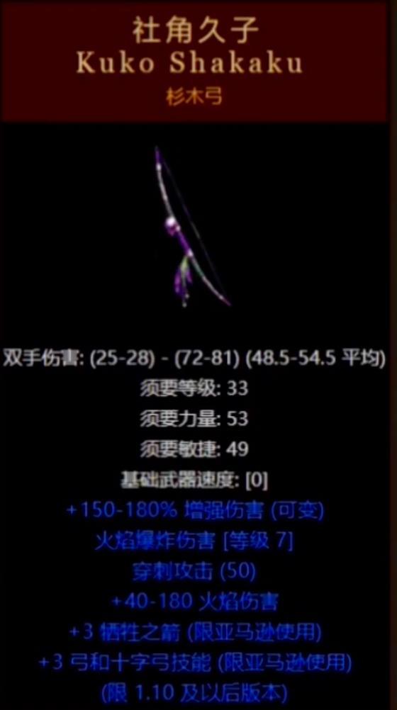 社角久子,也算是很出名的暗金弓了,而且爆率很高。作为弓马开荒人物最长使用的弓箭。高额的穿刺攻击配合亚马逊的被动技能,和火焰爆炸效果,在开荒过程中非常舒服,拥有很强的aoe能力。