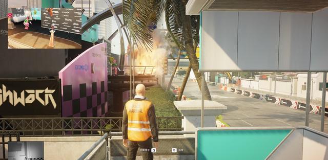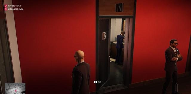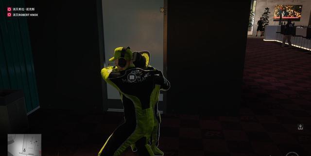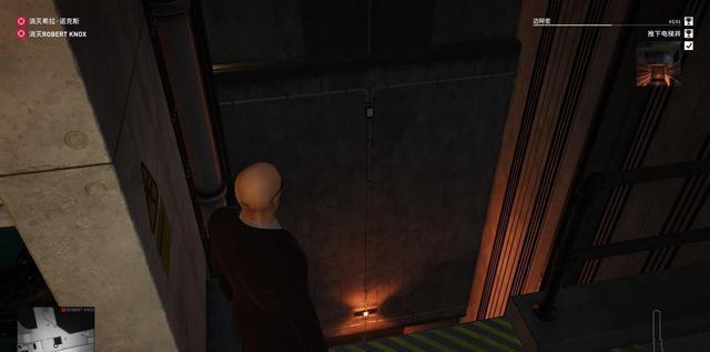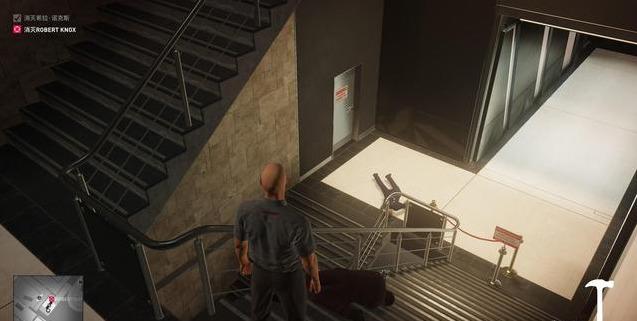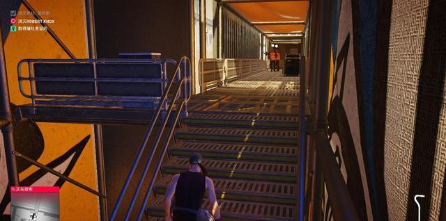 这里我们用之前涡轮增压的法子,将目标给引下来。当他们经过这个楼梯的时候,先将后面的保镖给击晕,再把目标给打晕(这里记得要把上面的监控给打掉)