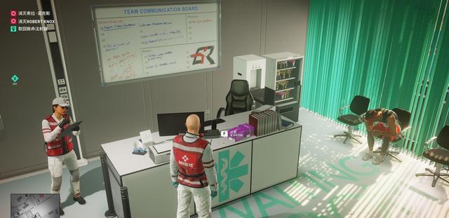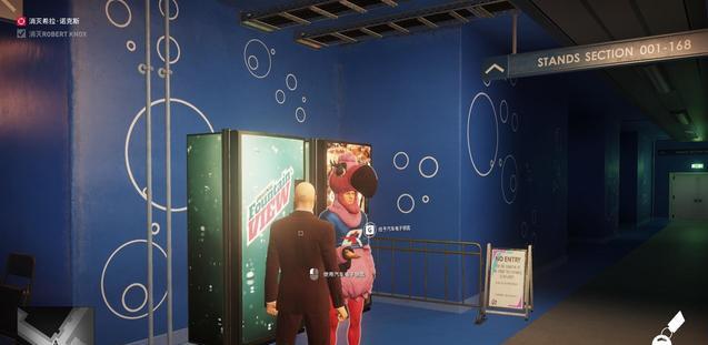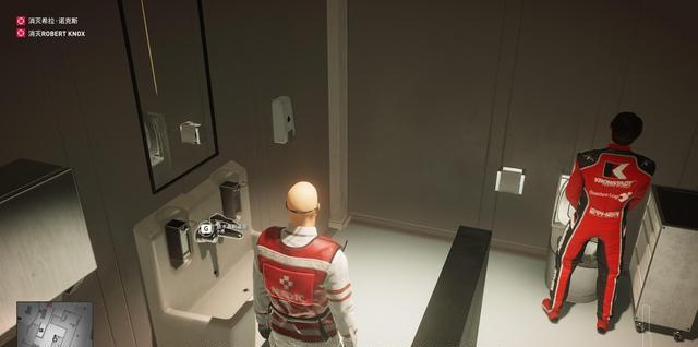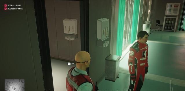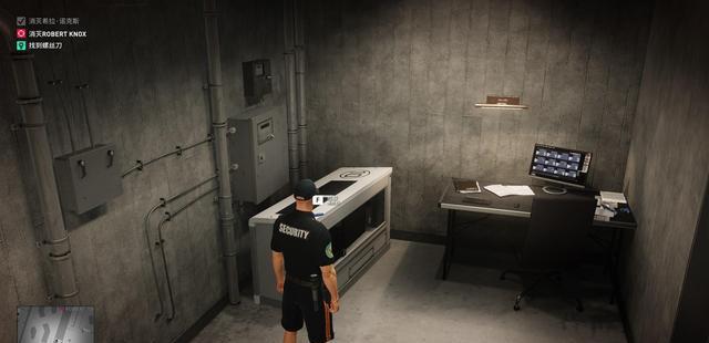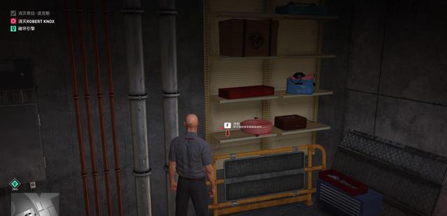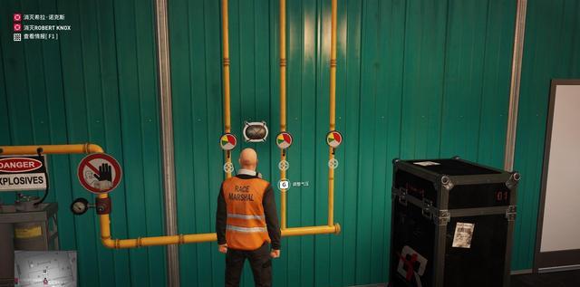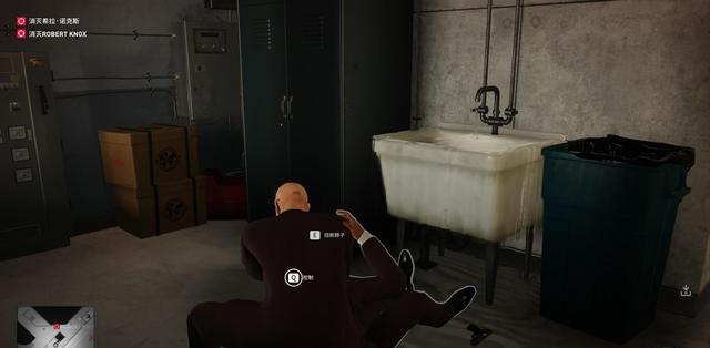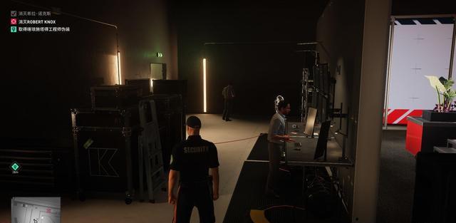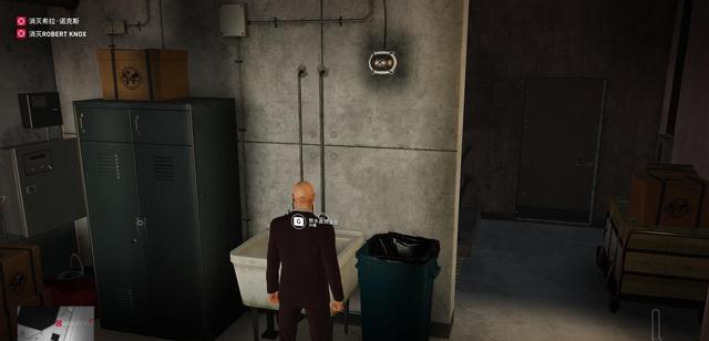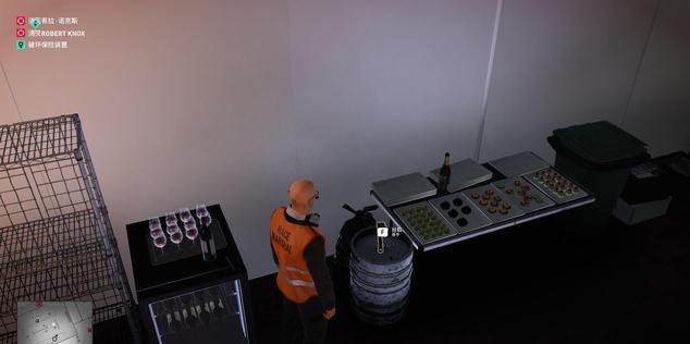 然后我们需要获得工程师的伪装,我们首先来到后台,不用去管那个正在沉迷小黄油的维修工,直接将一直在散步的维修工给击倒,然后拖到附近的箱子,获得伪装。(这里注意要无声制服,一旦你从正面搏斗打斗声会被听到)