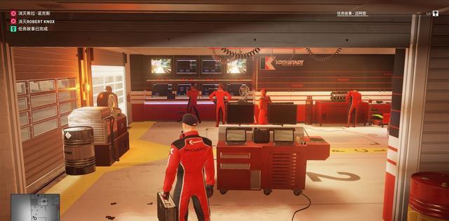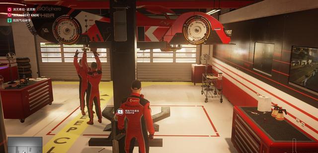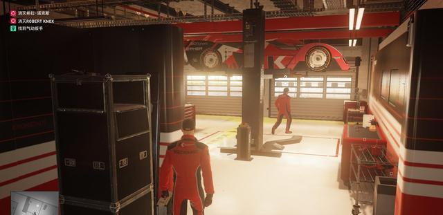 这里我们要去拿气动扳手,而气动扳手就在进入大门后直走再向右转的地方。可前面有个修车工老大是可以识破我们的伪装的。这里有两种方法,第一种是按下旁边的开关,汽车就会砸死修车工。(记得要等着两人一起站在车下交谈的时候,否则就会被发现)。