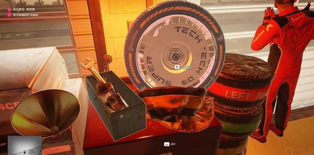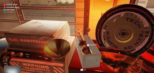 拿到气动扳手后来到这个位置。跟首席修车工交谈之后来到一旁放着赛车装备的地方。
