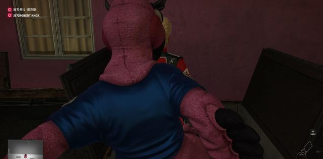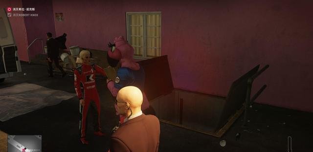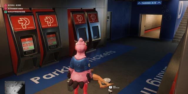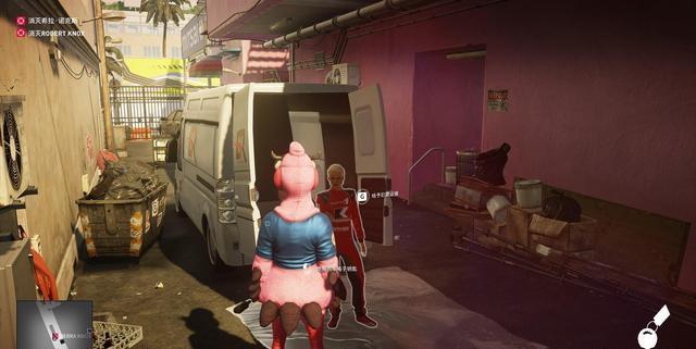 找到汽车后拿取勒索文件,再回到来假装把钥匙还给火烈鸟,这个倒霉的小家伙向你道谢后就会转身离开,趁他背对着我们得时候敲晕获得伪装。(记得要把他的尸体给拖到箱子里)