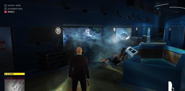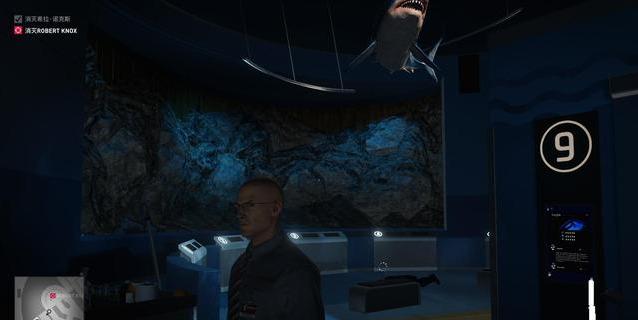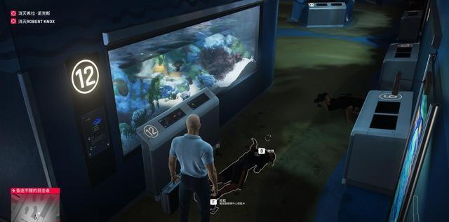 然后再把目标给拖到这条大鲨鱼的下面,用手枪打掉鲨鱼(这里要记得提前将海洋馆里的两个保安给放倒。)即可完成挑战。
