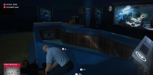 来到水族馆,等守卫来到水箱附近时,掏枪射击玻璃,水流就会把他们给冲晕,从而完成挑战。