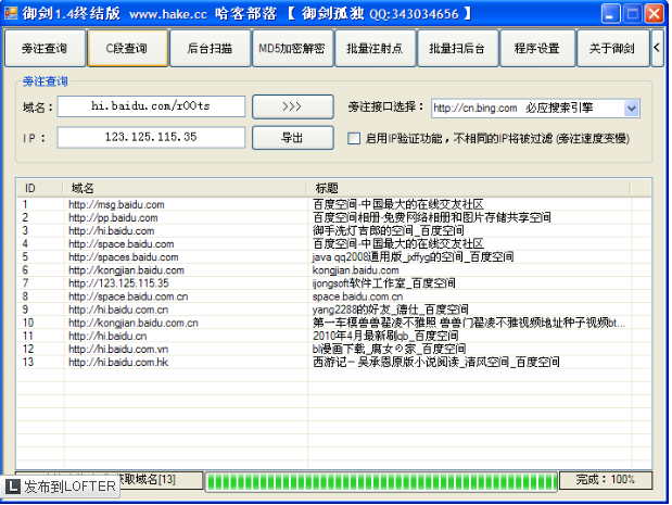 很显然这个小工具将自己的功能直接定位于旁注,打开运行后在左上角的"Url"处输入目标网站的域名,然后点击下方第一个"Get Ip"按钮就可以得到对应的lP地址;同时,在"lP Scope"中将得到的IP段起始值自动显示。然后,点击第三个"ScanC"按钮进行该C段服务器的扫描,结果会依次出现在下方的显示窗口中。当扫描结束之后(下方出现"Work completed"的提示),点击第四个"Export"按钮会调用浏览器打开刚刚得到的服务器扫描报告,都是超链接URL,可以直接点击进行访问。
