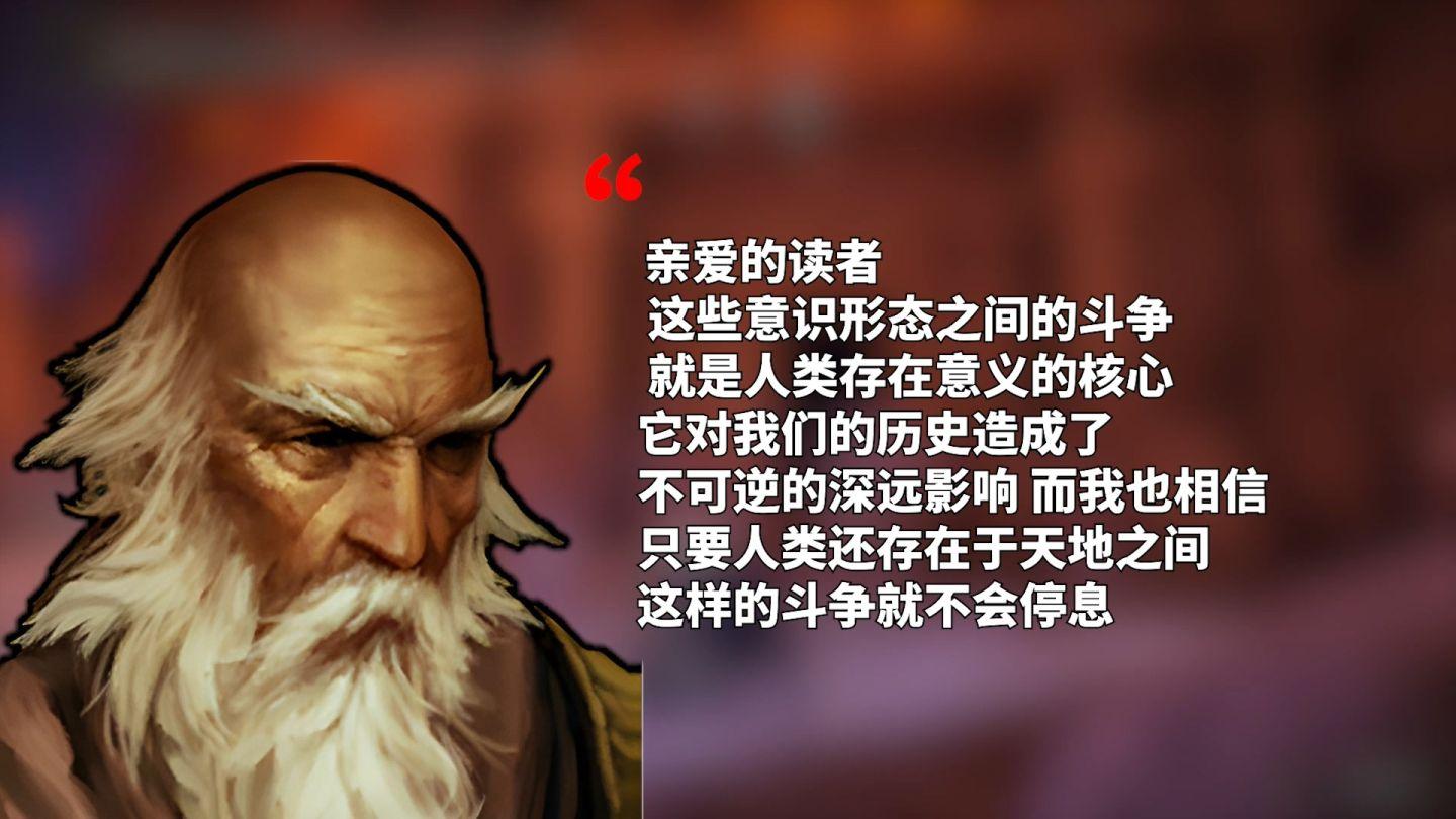 凯恩对这两个世界观的体现有了一段较为精确地回复:“亲爱的读者,这些意识形态之间的斗争,就是人类存在意义的核心。它对我们的历史造成了不可逆的深远影响,而我也相信,只要人类还存在于天地之间,这样的斗争就不会停息。”
