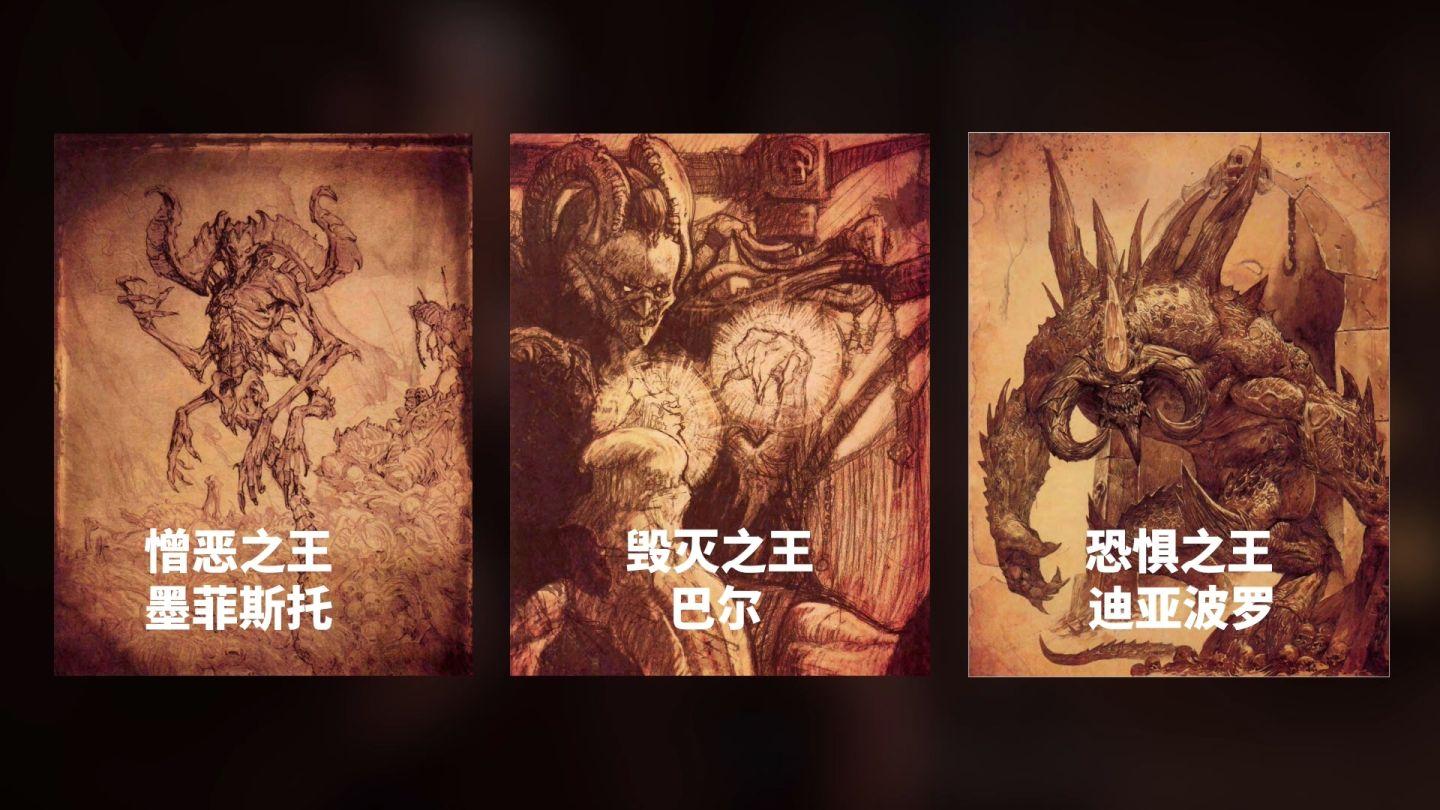 三大魔神分别是憎恶之王墨菲斯托、毁灭之王巴尔与恐惧之王迪亚波罗,迪亚波罗也就是咱们游戏的标题Diablo。