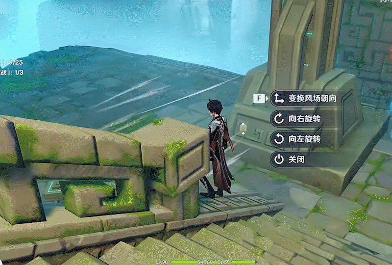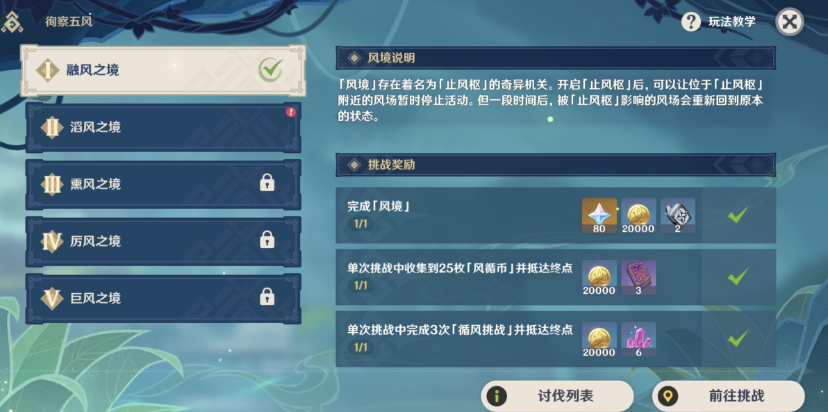 按照通过“套路”,最开始来到关卡的初始位置都需要关闭附近的风场,仔细观察金币的散落地点,调整风场的方向让自己的角色拾取到金币(前面所说的逃课,就是在这里利用万叶和温迪,不调整风场方向或者开启风场机关,也能通过自身位移拾取金币),而【循风挑战】就比较特殊,挑战时间一般都是在20秒之内,提前关闭风场机关,观察地形,选择合适的路径才能完成挑战。