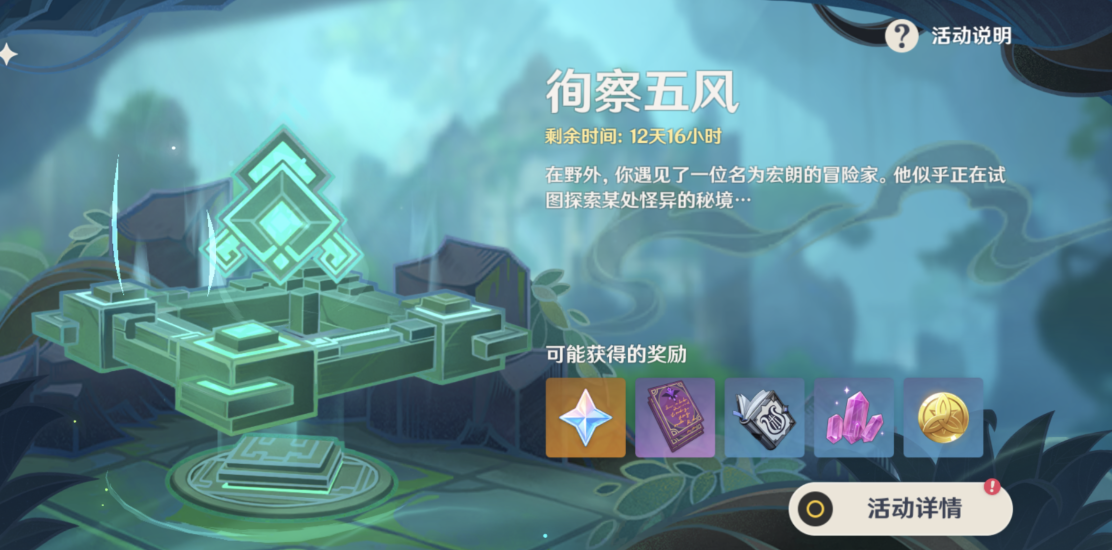 原神3.1版本下半场420原石活动【徇察五风】终于来了,这是继【百人一揆】后,我最期待的一个活动,不同于百人一揆酣畅淋漓的战斗,徇察五风活动更加注重解密和趣味性,在不断探索的过程中完成对应的关卡,原石、经验书、摩拉和天赋书等奖励非常丰厚,我们一起来看看。