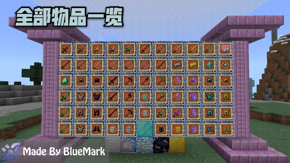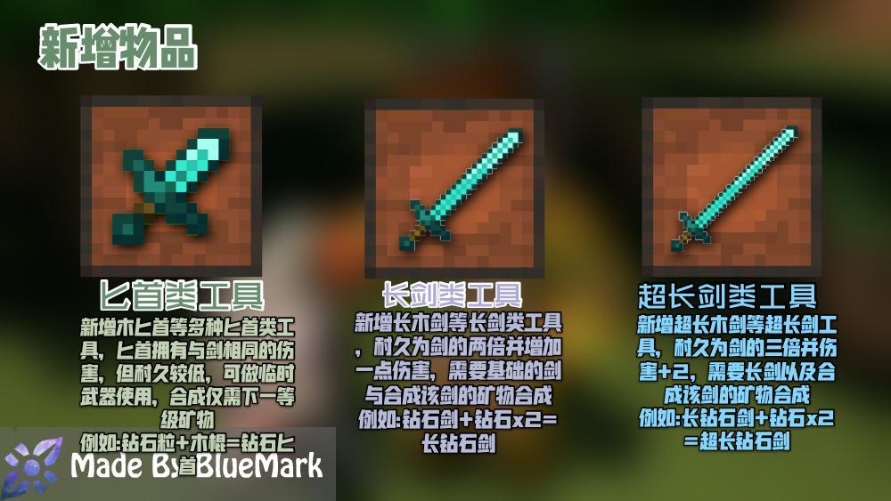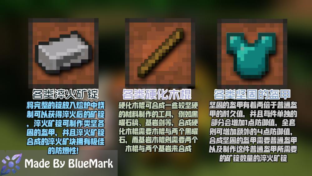 介绍:本组件在原版装备的基础上进行了拓展,每种矿锭的工具都有了新的拓展系列,并且还增加了黑曜石系列、绿钻合金系列、基岩系列的各种装备!可见下图部分工具、工具的拓展以及矿锭的加工工艺