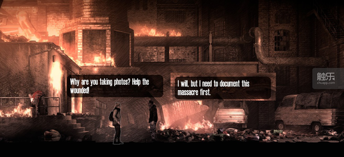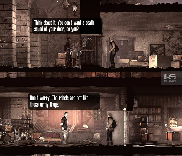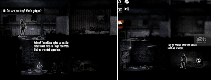 最大,也是最引起争议的是故事里人物立场的问题。作为《我战》的制作方,11 bit studios早先出品的《冰汽时代》,已经充分通过各种设计让玩家领教到他们对“自由”的歌颂和对“不自由”的极端敌视。《广播》里也不再假称客观,体现在故事中,就是代表当权者的军方成了单纯而彻底的反派。剧情里的军人恶意射杀平民取乐,绑架平民刑讯逼供,处处体现军方的邪恶。