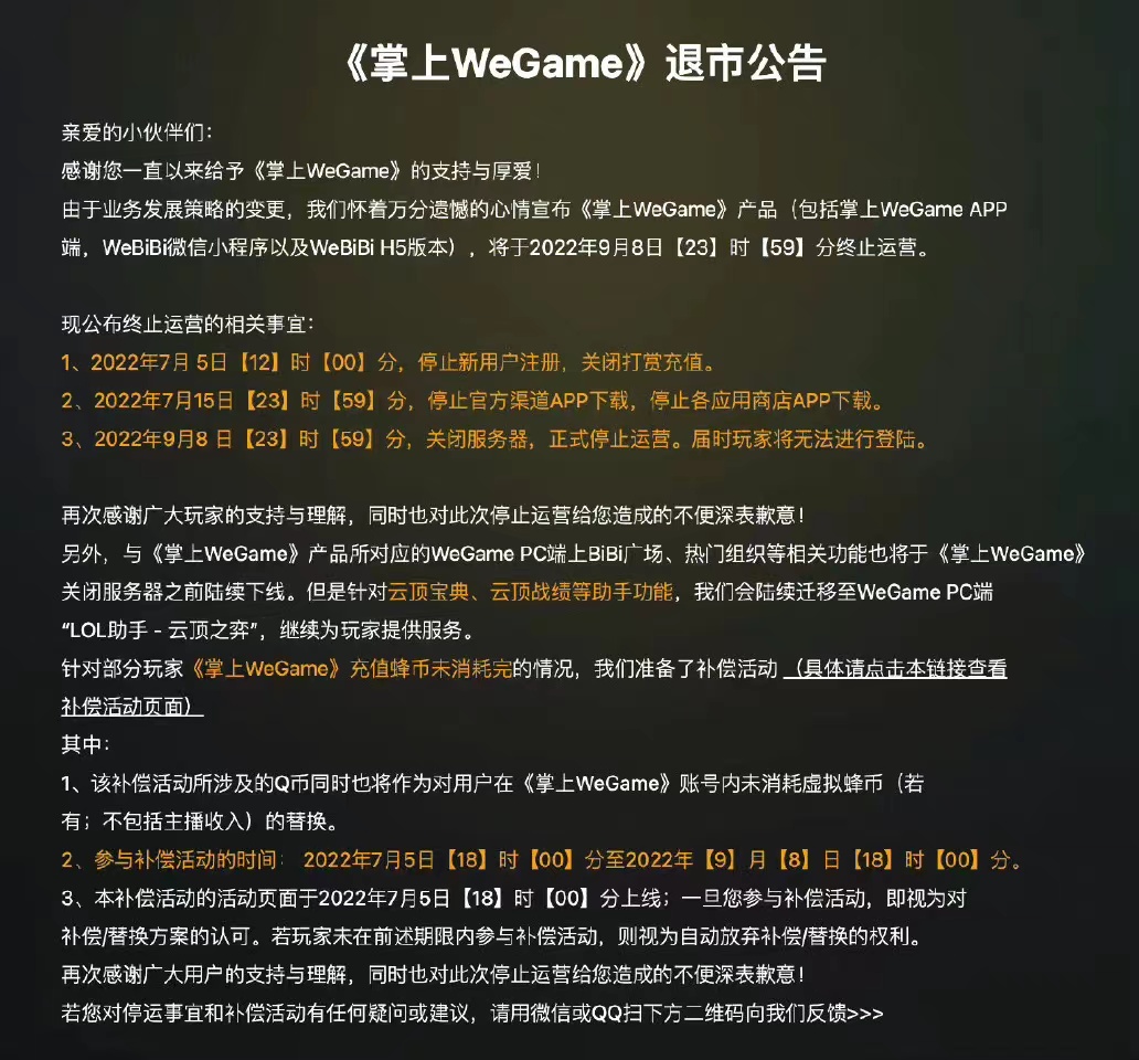 7月5日,《掌上WeGame》运营团队发布“《掌上WeGame》退市公告”称,《掌上WeGame》产品(包括掌上WeGame App端,WeBiBi微信小程序以及WeBiBi H5版本),将于今年9月8日23时59分终止运营。