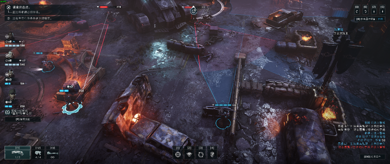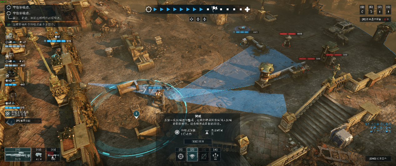 在实际的战斗中,玩家需要花费行动点数为武器重新换弹夹而不是使用一支无限弹药的枪械,这一点与《战争机器》非常著名的快速装弹的设定非常契合,都是讲求玩家在战术动作中强化对于子弹剩余数量的考虑,从而进步一完成下一步作战。再加上不同武器有着非常明确的射击距离和范围设定,就让玩家在这种每一步都需要深思熟虑的游戏环境下,必须要考虑清楚自己下一步要做什么。