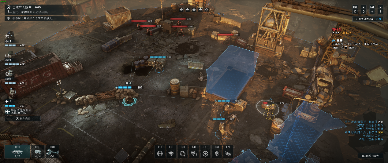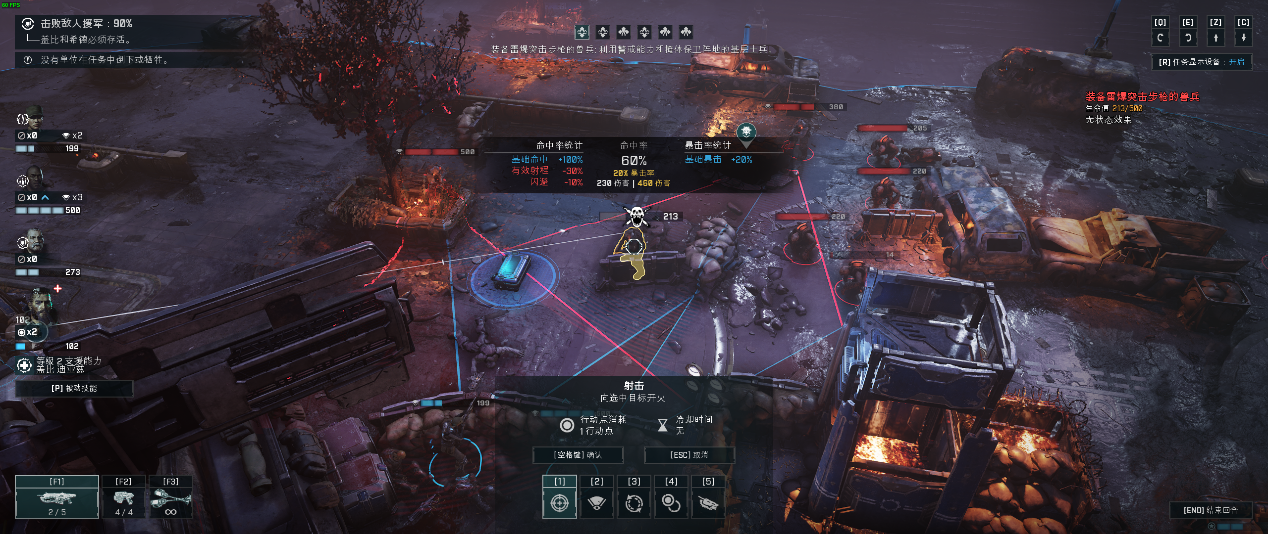 此外,玩家根据装备加成或是天赋的不同也拥有不同的行动点数,行动点数将会被使用在移动、射击、更换弹夹、警戒防御、使用技能和道具上。其中警戒防御的设定算得上游戏中非常有趣的玩法,也就是说在每次通过武器射击完毕后,玩家还能使用一次警戒防御功能,在敌方可能前进或者出现的区域通过预先瞄准的方式来主动防御敌方攻击,这样的设定不仅降低了游戏的难度,也为多种战术战略的选择提供了可能。