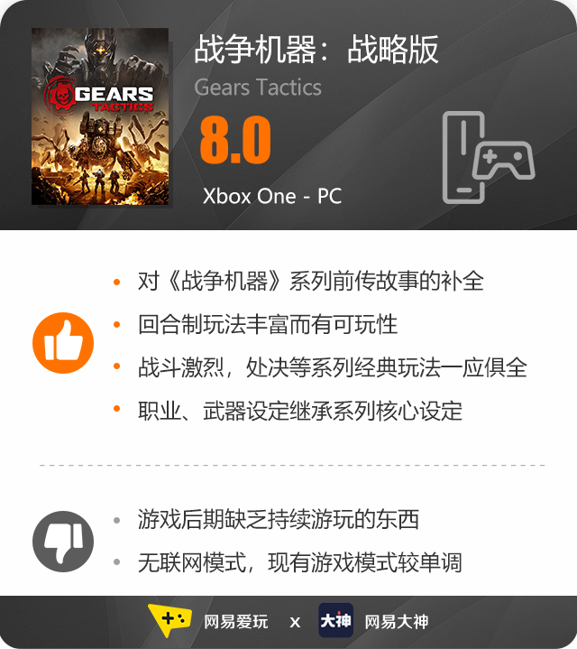 如果将《战争机器:战略版》作为一个新IP作品来看待,游戏目前仍稍显单薄,单人体验固然优秀,但是在后期重复的关卡和换汤不换药的敌人双重攻势下,也容易让人审美疲劳。不过如果从《战争机器》系列衍生品的角度来看,《战争机器:战略版》在填补了系列前传故事的空白,将不少人物之间的关系与故事梳理的更加清晰之余,也从另一个视角让玩家们再次审视整个系列故事的核心脉络。再加上游戏本身与《战争机器》系列中诸多设定的承袭与结合,更让一个看起来单薄的骨架有了更加丰满的肌肉来衬托,尤其对于原作粉丝和策略游戏双厨来说有着超高的吸引力。