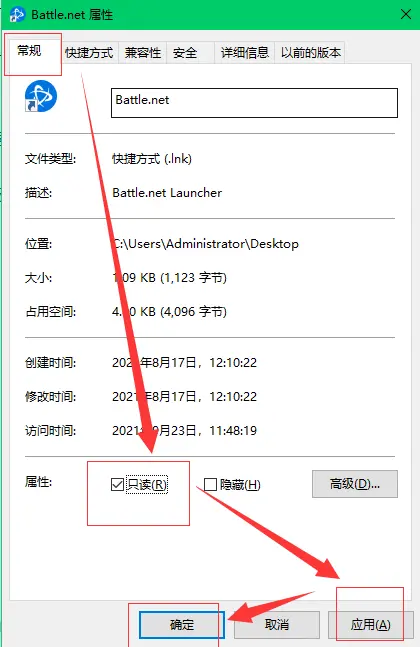 点击常规—只读—应用—确定 。