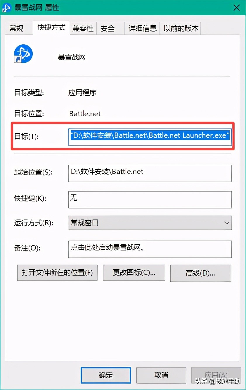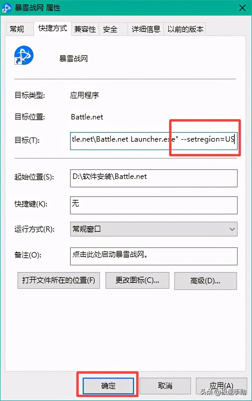 第三步,接着系统就会弹出暴雪战网的属性窗口,此时在窗口中,找到【目标】选项,然后后面有一串的安装地址,此时我们在这个安装地址的最后面,加上一个【 --setregion=US】,最前面有个空格,然后点击【确定】按钮。