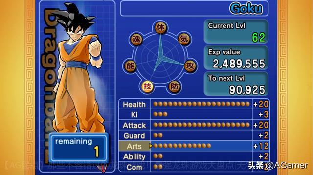 《武道会3》的角色并不多,一些角色或者角色状态需要通过特殊方式解锁,比如寻找龙珠向神龙许愿,或者到特定地点探索等等。角色的状态与技能都需要装备对应的胶囊才能使用,每个角色能够装备的胶囊格子是有限的,因此对战前还需要对角色的装备进行调整。例如悟空想要变身超4的话,就必须装备超1、超2、超3、超4这四个胶囊,想要大招是元气弹的话,就得装备元气弹胶囊,想要大招是龙拳的话,就得装备龙拳胶囊。使用什么技能,玩家可以自行决定,这种自由搭配的设计挺不错的。