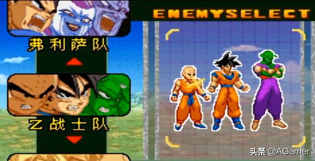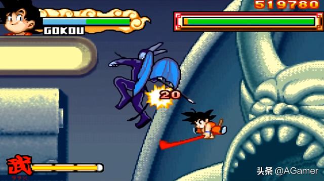 前面提到的《舞空斗剧》虽然素质极高,但还是有一点点瑕疵。那么有没有一款让我挑不出缺点的龙珠游戏呢?有的,那就是GBA上的《龙珠大冒险》,龙珠题材的横板清关类型游戏不多,《龙珠大冒险》称第二,没人敢称第一。拳、脚、跑、跳、尾巴飞行,筋斗云空战、金箍棒多种用途,玩法非常多。画面、音效、操作都十分舒服,随着流程进行,悟空还能增加体力槽和气槽,通关后还能解锁其他角色,甚至还能使用NPC进行流程,未曾设想的道路,我愿称之为绝活。
