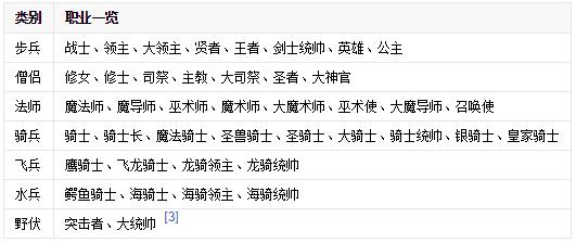 兵种大致分为步兵、骑兵、枪兵、远程、飞兵、神职、水兵、魔兵和不死生物几个特性,同一大类的单位根据所属阵营以及外观指数也有不同,例如常规骑兵被分为轻骑兵、重骑兵两种,并且同一个单位可能会具备不止一种特性。