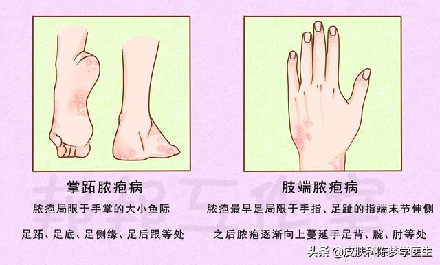 另一种叫肢端脓疱病(或连续性肢端皮炎),一部分患者有手指或足趾局部创伤或感染的病史,脓疱最早是局限于手指、足趾的指端末节伸侧,手指甲和足趾甲周围;