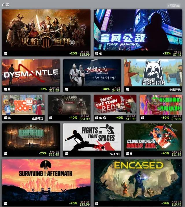 白银:火焰审判、全网公敌、DYSMANTLE、恐惧之间、俄罗斯钓鱼4、Rec Room、This Land Is My Land、Paint the Town Red、残暴小队、废墟图书馆、Fights in Tight Spaces、Clone Drone in the Danger Zone、末日求生、Encased、永恒边缘、部落与弯刀、In Silence、小动物之星、Melvor Idle、城镇叠叠乐、SURV1V3、First Class Trouble、脉冲星:失落的殖民地、奇妙探险队2、终极提督:航海时代。
