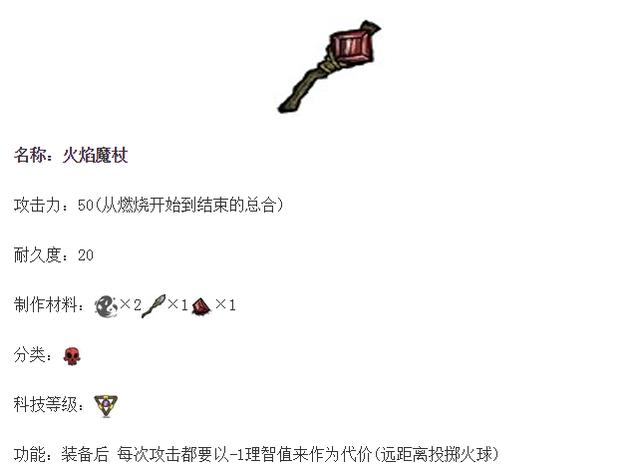 需要耗费掉一颗红宝石和两堆噩梦燃料的火魔杖比起造价更为低廉的冰魔杖却显得非常积累了,不仅常常使得怪物的掉落物化为灰烬,战斗时怪物身上的火苗一不小心还会对角色造成伤害,唯一的好处估计就是用来打打蜘蛛女皇和刚羊了.