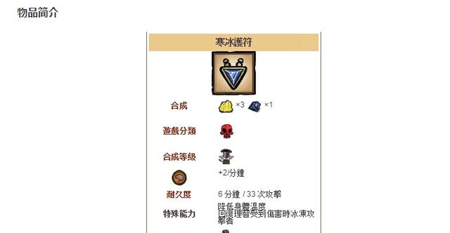 寒冰护符由三块黄金和一块蓝宝石合成,但仅能持续六分钟(相当于游戏内时间一天八分钟),由于耐久度比较低,本身的造价算是非常昂贵了.这块独特的护符能力也是非常不明显,其中之一的能力是保证我们在常规环境中不会进入过热状态而扣血,但是非常规状态该过热还是得过热.此外护符虽然叫寒冰护符,但是并不能让我们的角色免疫灼烧状态,而是在敌人主动对我们进行打击后,有可能进入冰冻状态,该效果始终弱于冰魔杖的冰冻效果.对了,千万不要在冬季佩戴这块护符,不然角色还会因为过冷而扣血.