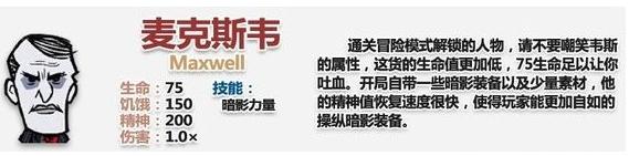 b、Maxwell(麦斯威尔)是第八个可以解锁的角色,而且是凡人状态出现(即是会死)。Maxwell 整体而言只有较低的生命,但因为他衣冠楚楚的绅士风格(席编:....), 理智值每分钟会上升20点。Maxwell开始游戏时会有他独特的装备,令他在刚开始游戏时马上就可以进行各种活动。